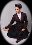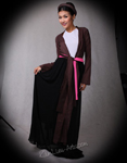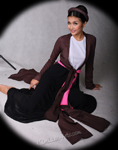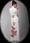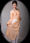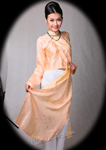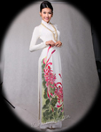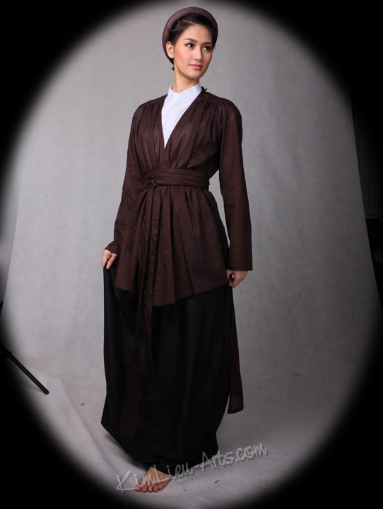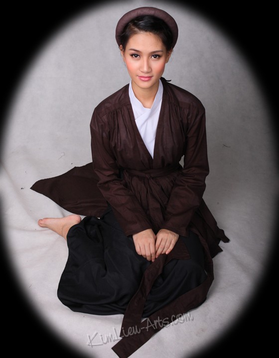 Ao Tu Than (4-paneled) – Toward the end of the 18th and beginning of the 19th centuries, Vietnamese women wore the Tứ-Thân, a plain cotton tunic in dark colors. Open at the front the dress had two-flap split at the waist. The two flaps in the back were sewn together. The dress was worn outside of an undergarment (yem). The four flaps represent the woman's parents and in-laws (tứ thân phụ mẫu). A long dark color skirt was worn under the dress and a belt is tied outside the dress at the waist.