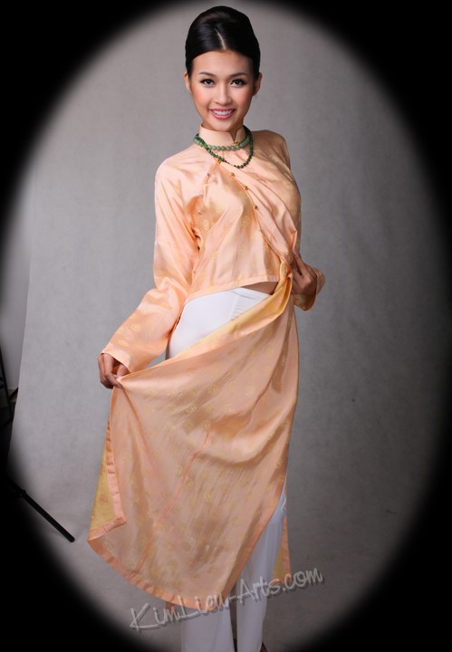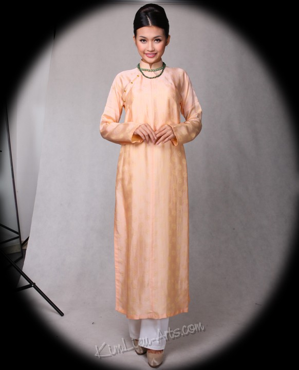 Ao Ngu than (5-paneled) – In the early 19th century the Tứ-Thân evolved into the Ngũ-Thân. The "five" includes the four panels of the Tứ-Thân, a little panel was added underneath the front flaps. These flaps represent the five traditional human virtues, such as compassion, loyalty, respect, intellect, trustworthiness (nhân, nghĩa, lễ, trí, tín). Brocade is usually used for the gown with broader flaps and sleeves. Loosely fit and high collared, the gown is buttoned in the same fashion as the modern "ao dai".