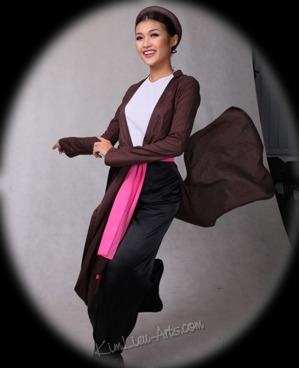 Ao Giao Lanh – Vietnamese women wore long-skirted outfit as early as the mid-17th century. However, it was Lord Nguyen-Phuc Khoat who decreed the very first and complete development of costumes for the woman. The oldest outfit is known through pictures preserved at the School of Extreme Orient as the Giao-Lãnh dress. The outfit included a long cotton dress in only dark brown or black, worn outside of a beige cotton blouse, and on top of an ankle-long black skirt. The outfit was completed with a round-shaped conic hat (nón quai thao).